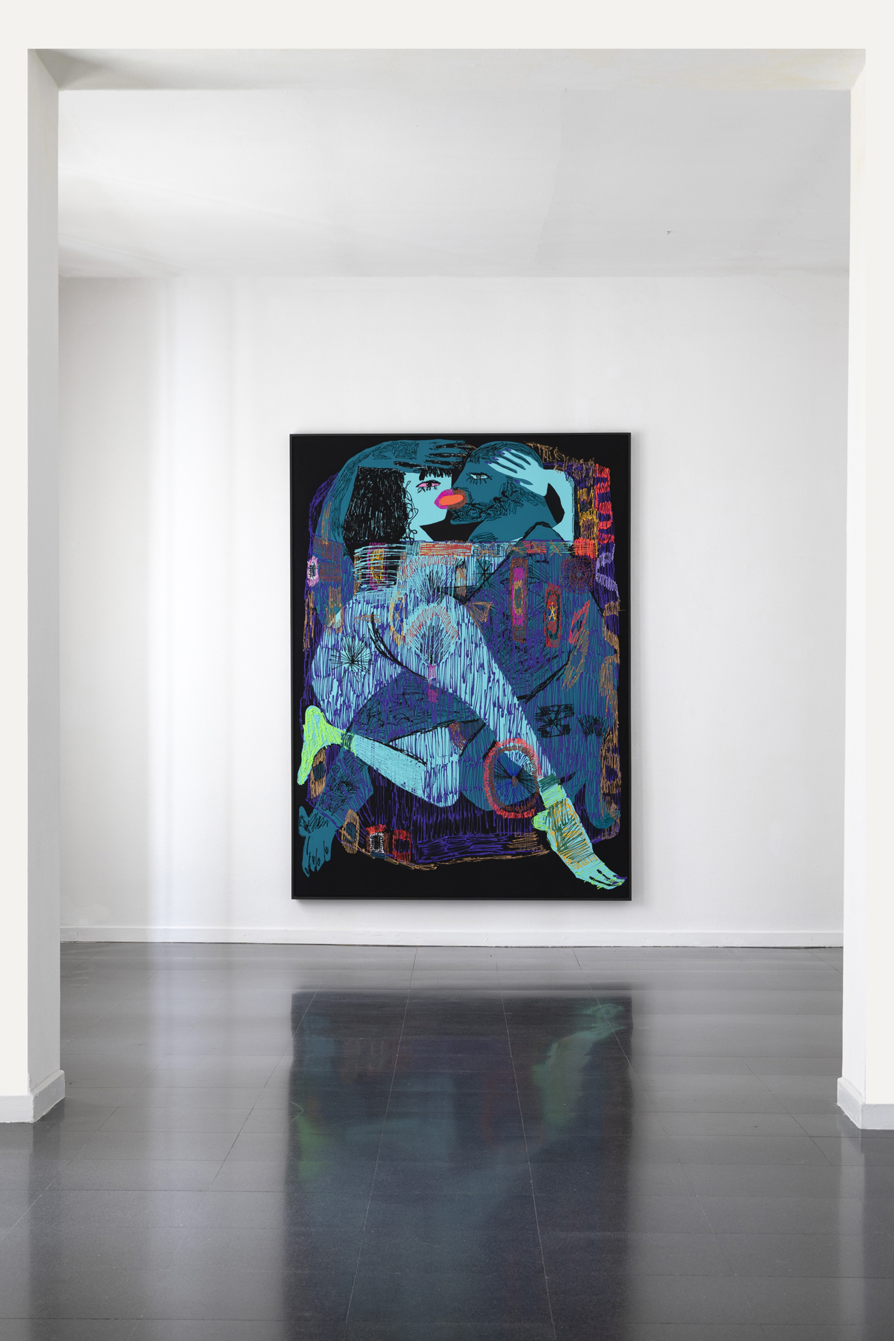 Wheat’s practice is informed by drawing—where line as a foundational element allows for layers of high-key color to activate the space. Using her unique method of pushing medium through the back and onto the front of screen surfaces—positioned somewhere between painting and textile—she depicts intertwined bodies and a smattering of everyday objects that reform histories depictions of women. In her practice, Wheat is influenced by both ontological and art historical forerunners, citing Leonardo da Vinci (Italian, 1452–1519), Rembrandt (Dutch, 1606–1669), Edgar Degas (French, 1834–1917), and Andy Warhol (American, 1928–1987), and concepts connected to intimate, universal, and cosmic space, mirroring, nature, and love. Wheat’s contained worlds foreground female figures and signal the artist’s broader aim to refocus histories lens.